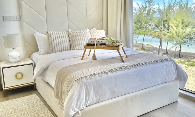 Large, perfectly working kitchen set. A seating area where guests can unwind and watch television. A balcony with a breathtaking panorama. You can enjoy a breathtaking view of the beach and ocean while you're laying down on the master bedroom bed. And enjoy a mesmerizing sunrise while laying down on the comfy bed. Our property is directly across from the beach and the ocean.