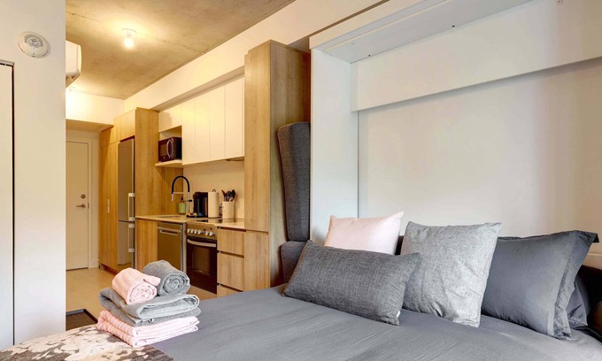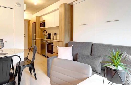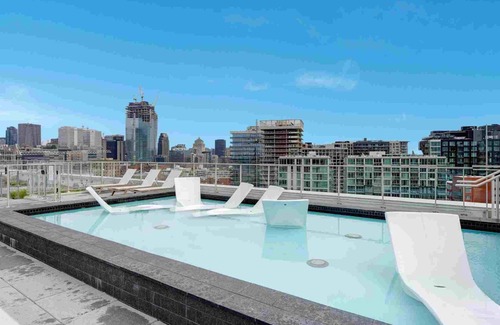 Enjoy a modern condo in the heart of Griffintown near downtown with indoor and outdoor pools.