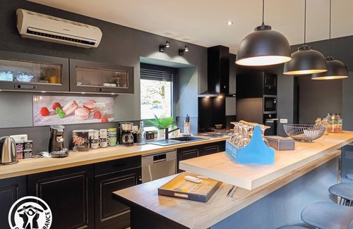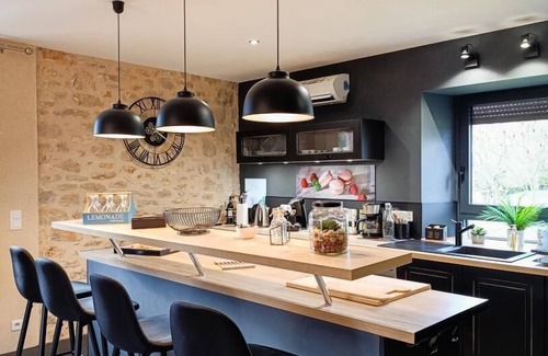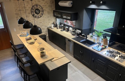 Le Balcon de Louise has the typical charm of the stone houses of the Causses du Quercy...but push the door open and you will be pleasantly surprised by this totally new interior! From the entrance, the kitchen with its daring shades of black glitter and light wood sets the tone! the vast living-room with a warm atmosphere and the bedrooms, all personalized, will conquer you...the whole decorated with a lot of originality and equipped with antique and tastefully customized elements! without forgetting the top-of-the-range equipment for an optimal comfort and well-being...nothing has been forgotten to offer you an unforgettable stay. Only 3 kms from all the shops and services, in the centre of the department and therefore close to the unmissable tourist sites to visit, Le Balcon de Louise has an immediate appeal, where you feel good...a real "coup de coeur"!On the ground floor, fully equipped kitchen with built-in units, laundry room, separate toilet; a dining area, living room and lounge area with large corner sofa and flat screen TV. Upstairs: 4 bedrooms including 3 bedrooms with a bed 160, and a bedroom with 2 beds 90; all bedrooms have their own shower room + wc. Electrically operated roller shutters, reversible air conditioning, wifi. Outside, a beautiful terrace shaded by a wisteria in season, wooded grounds (with a planned swimming pool), parking.