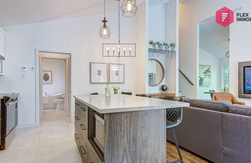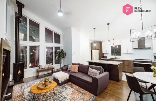 As soon as you arrive, you will be impressed by the aerial rooms, the astral lighting and the beauty offered by the countless windows overlooking the forest. The dining room, perched in nature, is simply angelic with its wooden table carved from a tree from the Plains of Abraham in Quebec City. And the luxury continues with the intimate, underground hot tub, it's the 7th heaven ;-)
