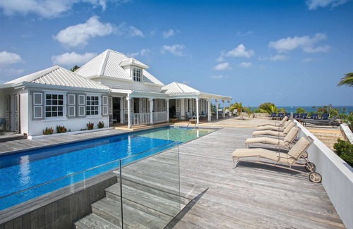 This seven bedroom, 7.5 bath villa has recently been completely remodeled and combines traditional French Caribbean architecture on the outside with the comfort and convenience of modern interiors. A large blue mosaic-lined infinity pool provides the centerpiece for the main terrace and overlooks both the Caribbean Sea and the Simpson Bay Lagoon with Dutch side St. Maarten in the distance. The terrace is paved with stone and hardwood decking surrounds the pool with elegant sun loungers for sunbathing. A spacious poolside gazebo provides a plush outdoor living space with plenty of shade from the sun and the ideal spot in the evenings to view the beautiful Caribbean sunsets. A second covered area equipped with a gas BBQ and wet bar provides alfresco dining and a beautiful sea view.