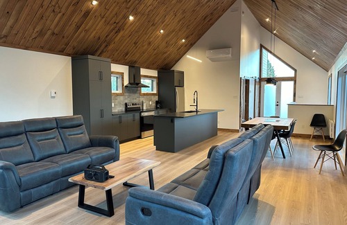 Come discover this unique chalet in Mont-Sainte-Anne specially designed for mountain bikers and cross-country and alpine skiers. With its mudroom you can leave your bicycles and skis inside in complete safety. You can also relax in the spa and sauna. In addition, a beautiful pitfire has been set up to extend the evenings in good company. Inside, you have a gas fireplace in the main living room and a second living room in the basement for the kids. You will have 2 large bedrooms with queen beds and a third bedroom with a double bed and 2 single beds. As for the kitchen, all the necessary equipment is at your disposal for cooking. Outside, you also have a table for dining on the covered terrace where the barbecue is also located.