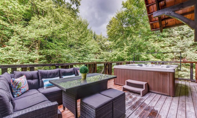 This beautiful chalet offers you a private hot tub on the balcony to relax in. A wood-burning fireplace in the living room.