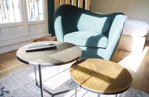- A convivial living area with two armchairs, coffee tables, a chest of drawers and a TV. It can also be used as a dining area, as there is no dining table in the apartment.
