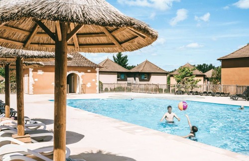 Residence "Le Domaine de Claire Rive", 2 storeys, surrounded by meadows. 28 houses in the resort. 108 apartments in the residence. In the hamlet Balat-Grand 1.2 km from the centre of Prayssac, 22 km from the centre of Fumel, 28 km from the centre of Cahors, 100 m from the river. For shared use: natural state property 7 ha (fenced) with plants, swimming pool heated, fenced (20 x 11 m, depth 60 - 140 cm, seasonal availability: 24.May. - 14.Sep.). WC in the pool area, children's pool, outdoor shower, table tennis, boccia, children's playground. In the complex: reception, WiFi, washing machine, tumble dryer (for shared use, extra). Parking (limited number of spaces) on the premises. Shop 1.2 km, supermarket 1.2 km, bus stop 1.2 km. Please note: car-free holiday complex. Residence with electric gates. The photograph shows a typical example.