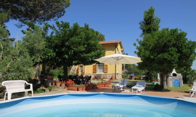 Large house "Le Fagiode", surrounded by trees, meadows and fields. 400 m from the centre of Pastina, on the outskirts, 25 km from the centre of Cecina, 40 km from the centre of Livorno, on a slope, 20 km from the sea, in the countryside. Private: property 6'500 m2, terraced garden with wildlife garden and trees, natural garden, swimming pool (5.30 m diameter, depth 100 cm, seasonal availability: 30.May. - 01.Oct.). Outdoor shower, patio, pergola, terrace, garden furniture, barbecue, children's playground, pool maintenance by the owner/gardener. In the house: roof terrace. 100 m long bumpy motor access. Parking (for 4 cars) on the premises. Shop 400 m, supermarket 20 km, sandy beach "Castiglioncello" 22 km, rocky beach "Castiglioncello" 22 km. Marina 20 km.