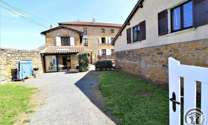 For a holiday or a weekend in the 'Pierres Dorées' area of the Beaujolais, this gite renovated in 2012 is ideally situated (secondary road 76 nearby) just 2,5 km from the city of L'Arbresle & 25 km from Lyon. House built of local golden stone, adjoining the owners', winegrowers, home & a 2nd gite. Lots of activities available in the surroundings : Aqua-centre, go-kart site, quarries of Glay (protected area 3 km away), Zoo of Courzieu, La Tourette Convent (from Le Corbusier), Oingt listed village, 15 km away). Guests may sample the estate wines & farm produce having a wine-grower's aperitif (farm aperitif labelled Bienvenue à la Ferme) : a friendly moment ! Separate access. Closed off glassed-in veranda. Ground floor : living room (26 sq.m), kitchen/ lounge areas. WC. 1st floor: 3 bedrooms (double bed) (3 single beds) (2 single beds), 2 shower rooms, WC. Central heating. Mobile phone, cot & child's bath available on request. Fenced private garden (whithout wire netting), garden furniture, BBQ, table tennis. Only 1 pet allowed per stay.