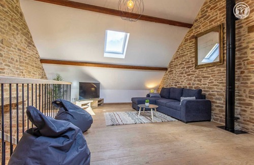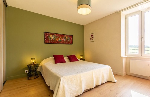 Specializing in teaching children to ride, Laurence & Nicolas welcome you to an authentic 16th century Burgundian farmhouse full of history (once linked to the lords of Brancion), carefully restored with style according to the rules of the art. Absolute calm in the hollow of a magnificent preserved setting, overlooking a beautiful plain of bocage, rivers & meadows on the foothills of the wooded hills of the southern Burgundy massif (protected natural territory dotted with many hikes & splendid viewpoints) adjoining the charming little typical village of Etrigny & its rich heritage. Vast family property of 15 ha housing a "pony club" riding school dedicated to children from 2 to 12 years old & a discovery farm with very docile "miniature" species ("mini" cows, pigs, sheep, goats, donkeys, rabbits ...). Many activities on site. Superb panorama & landscapes. Very comfortable cottage. Spacious living areas. Elegant contemporary country style combined with refined restoration (stone walls, beams, original wooden lintels). Lots of style, charm & character between modernity and tradition. Cocooning and ultra cosy. Warm zen & soft atmosphere. Double gravel terrace (exposed/shaded). Pleasant intimate garden, planted with trees and plants, with a beautiful private swimming pool (6x3m). Composition: Detached house adjoining the owners' home and second gîte (total independence). Wifi. Wood pellet stove (provided) + electric heating. Ground floor: living room-kitchen. Half-floor: 2 bedrooms (double bed 160x200cm in each) including 1 with private bathroom (shower), bathroom (shower), separate toilet. 1st floor: mezzanine. living room (sofa bed 140x190cm as an extra), 2 bedrooms (2 single beds 80x190cm + 2 single beds 90x190cm / double bed 140x190cm), bathroom (bath/shower), separate toilet. Garden + swimming pool + terraces + private parking. Closed bicycle storage. Possibility to rent gîte 1454 on the same property (5 people)