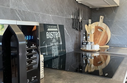 Cuisine équipée avec lave-vaisselle et machine à expresso Tassimo.