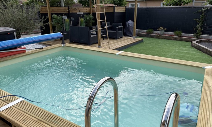 Charmante maison mitoyenne avec son boulodrome, son barbecue, son coin détente avec sa pergola, sa terrasse en bois de 50m2.