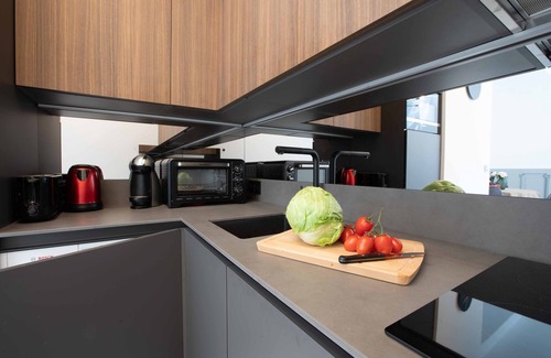 Inside, this one-bedroom holiday apartment is well-equipped and features air-conditioning, a contemporary-style living room and a diner that comfortably seats 4. This is accompanied by a full kitchen with all essential utilities, including a coffee machine, dishwasher, microwave, oven and induction hob for the guests to enjoy preparing meals and dining in at their own sweet pace.