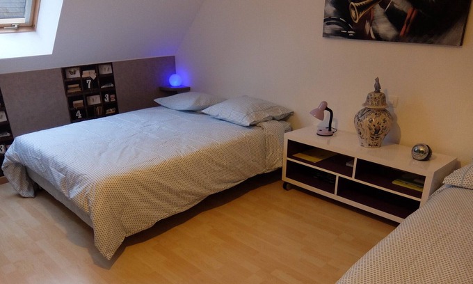 We offer a room on the floor (20m2), sunny, pleasant, with 2 double beds (+1 BB bed and / or 1 folding child bed), bathroom suite, very quiet area, 7 km from downtown LE MANS. Ideally located for the circuit of 24 Hours of Le Mans (1 km from the circuit). Conveniences and public transportation nearby. We ourselves are great travelers and enjoy sharing, speak French and English (house type F5 with our golden Murphy and our two cats Bamboo and Nénette).