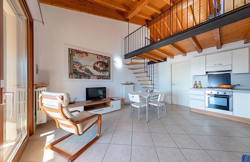 This apartment, provided with free Wi-Fi, welcomes guests onto the bright living room equipped with a sofa bed, dining table with chairs, flat-screen TV, fully equipped kitchen with refrigerator, freezer, oven, microwave, electric kettle, dishwasher, coffee machine and toaster; the living room leads, through French doors, to the outdoor private and covered terrace provided with a dining table with chairs, for lakeview lunches and dinners; also, at our guests' disposal a private rear garden. The sleeping area is composed of a double bedroom, equipped with a queen size bed and wardrobe, and the bathroom with shower, wash basin, bidet and WC. A loft in the living room area, provided with a comfortable double bed for two, air conditioning, flat-screen TV, and an additional toilet complete the layout. Guests can benefit from a small laundry area with washing machine, iron and ironing board located next to the garage.