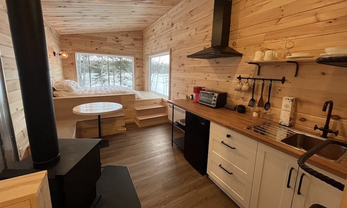 Cozy tiny house with a view on the river. Perfect getaway to relax and diconnect in the nature. 5 min. from all amenities. Queen bed in the window and double bed up the ladder, full bathroom, Wood stove and AC.