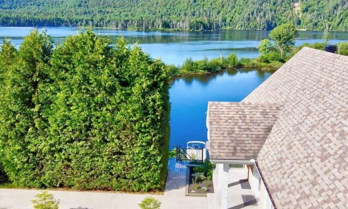For added privacy, the master bedroom is adjacent to its private bathroom. Admire the outdoor space and the splendid river view from the wooden patio (with an outdoor fireplace), the dock, or one of the large stacked glass balconies. Or cozy up by the indoor fireplace in the generous main cathedral ceiling living room. Feel like cooking? A fondue pot and a 4-season BBQ are also available to awaken the chef in you. Board games, a billiards table, and Wi-Fi internet access are available to entertain both young and old.