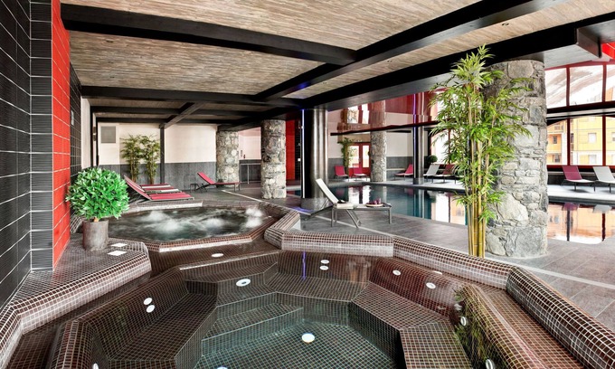 Beautiful, rustic, comfortable residence "CGH Résidence & Spa Le Télémark". 52 apartments in the residence. Above Tignes-Le Lac 250 m from the centre of Tignes, on the outskirts, 30 km from the centre of Bourg-Saint-Maurice, 750 m from the lake, directly by the skiing area. For shared use: indoor pool heated (13 x 7 m, seasonal availability: 01.Jan. - 31.Dec.). In the complex: reception, lounge, WiFi, sauna, fitness room, massage (extra). Steam room, hot tub, lift, storage room for skis, washing machine, tumble dryer (for shared use, extra), ski boot dryer. Bread roll service. Storeroom available. Communal covered parking (extra). Parking space or garage only for small to medium-sized cars. Dimension: height 190 cm. Shop, restaurant 250 m, railway station "Bourg Saint Maurice" 33 km, lake Lac de Tignes 750 m. Golf course (18 hole) 2.5 km, tennis 1 km, walking paths from the house 20 m, ski lift 150 m, slopes 20 m. Well-known ski regions can easily be reached: Tignes – Val d'Isère (Espace Killy). Please note: baby equipment on request (included). In case of good snow conditions, the house is accessible on skis. The photograph shows a typical example. The holiday properties may differ in living space, floorplan, equipment and furnishing.