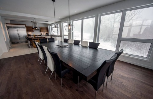 We have huge common areas. A fenestrated living room with 20 foot high ceilings. A kitchen with an island and a solid wood table capable of seating 18 people will allow you to have beautiful evenings with family and friends. In addition, a billiard room with a flat screen HDTV to relax. For those who prefer movies or video games, a home theater with a Full HD screen is also available. For your comfort, a three-sided fireplace and heated floors will keep you warm. Finally, a spa is available year round for your enjoyment. Everything is thought for you. Hope to see you soon!