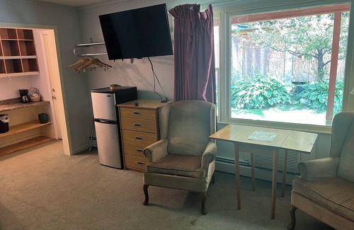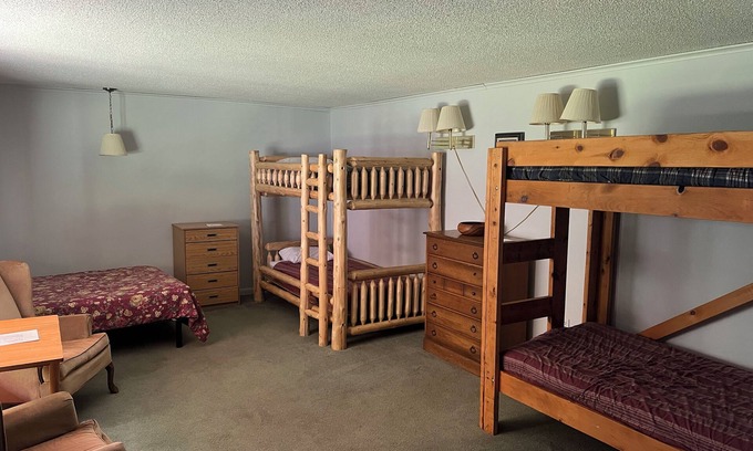 Large Family Room with 2 bunk beds (4 twins) and 1 double bed, perfect for families or groups. Enjoy the comfort of air conditioning, plus a microwave and refrigerator for added convenience. Relax in the sitting area with a flat-screen TV, making it easy to unwind after a day of fun. Spacious, cozy, and family-friendly. Pets are also allowed. Outdoor Accomodations include Grill, Leans tos and swings. With the best view of Whiteface Mountain in the area