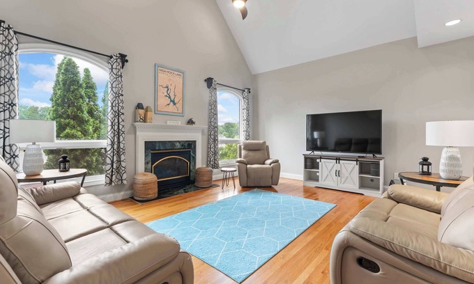 Indoors, soaring ceilings sit atop brightly lit, open spaces adorned with contemporary furnishings and stylish décor. Gather in the living room to relax and connect while seated on plush leather sofa and recliner seating, the smart TV streaming all your favorite shows. The spacious, fully equipped kitchen showcases stainless steel appliances, sleek countertops, and soothing blue cabinetry stocked with all the comforts of home. Join together for meals large and small at the kitchen table with views of the lake or in the dining room at the formal table, each seating 6.