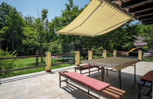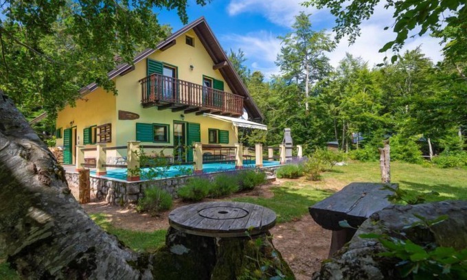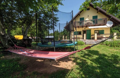 Lukovo 13 km from Fužine: Single-family house "Legendao", 900 m a.s.l., 2 storeys. 10 km from the centre of Lič, 22 km from the centre of Selce, 22 km from the centre of Novi Vinodolski, in a quiet, sunny position, along the wooded area, 22 km from the sea, 13 km from the lake, in the countryside. Private: property 3'000 m2, lawn 2'000 m2 trees. Outdoor shower, table tennis, volleyball, badminton, barbecue, children's playground (swing). In the house: internet access, table football, trampoline, washing machine, bicycle rental. Motor access to the house (50 m via unmade road). Parking (for 4 cars) at the house on the premises. Shop 10 km, restaurant 1 km, bus stop 13.1 km, pebble beach 22 km, public bathing area 22 km. Riding stable 16 km, walking paths from the house 500 m, cycle lane 550 m. Nearby attractions: jezero Bajer 13 km. Please note: suitable for families. Available: darts (included). Owner can organize paintball activity and deliver rented bicycles to the house.