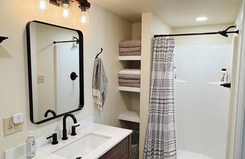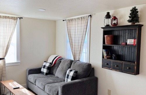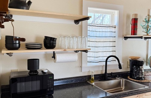 In the loft there is a cozy queen size bed and a full size bed, though much more comfortable than camp! The living room boasts a smart TV and a full size sofa bed. There is a small dining area, the kitchenette has a microwave and mini fridge with freezer and a set of dishes, glasses and silverware. There is a full-size coffee maker with all the fixings for a great cup of coffee or tea. The bathroom has a full shower and hair dryer. Extra linens are in the hall closet.