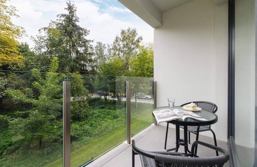 The property is located on the edge of Lotników Polskich Park, which will delight lovers of greenery. The picturesque view from the balcony is conducive to relaxation in the open air. Motorized guests can use a parking space in the garage.