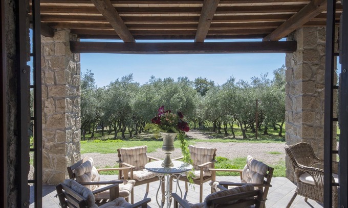 the ceilings conserve exposed beams and chestnut wood trusses. All around large green areas with olive and fruit trees, as well as cypresses and other lush plants that adorn gazebo and pergolas.
