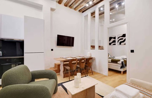 Ideally located, surrounded by quaint boutiques, gourmet restaurants, lively cafés and superb monuments. You can explore the cobbled streets of the Marais, visit the Louvre, stroll along the Seine or enjoy the many theaters and cultural attractions nearby. Immerse yourself in the bustle of the Sentier district, where authentic charm meets bubbling energy, an authentic Parisian experience!