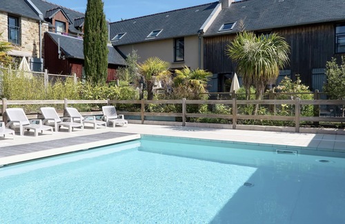 Cosy resort "Les Hauts de la Houle", 2 storeys. 50 apartments in the residence. Above Baie du Mont-Saint-Michel 600 m from the centre of Cancale, 22 km from the centre of Saint-Malo, in an elevated position, 700 m from the sea. For shared use: property, well-kept garden with lawn and plants, swimming pool heated (15 x 6 m, depth 145 cm, seasonal availability: 01.Jan. - 31.Dec. pool opening hours: 09:30-19:45). Hot tub, terrace. In the complex: sauna (extra). Storage room for bicycles, washing machine (for shared use, extra). Grocery 600 m, bus stop "Cancale Eglise" 700 m, railway station "Saint-Malo" 22 km, sandy beach 4 km. Please note: the photograph shows a typical example. The holiday properties may differ in living space, floorplan, equipment and furnishing.