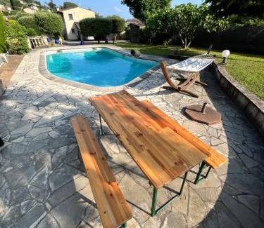 Les Jarres Bleues - Haut de Villa is a recently renovated apartment in Vence where guests can make the most of the garden and barbecue facilities. This property offers a private pool, free Wifi, and free private parking. Allianz Riviera Stadium is 11 miles away and Russian Orthodox Cathedral is 12 miles from the apartment. Offering a terrace and mountain views, the spacious apartment includes 2 bedrooms, a living room, flat-screen TV, an equipped kitchen, and 1 bathroom with a bath. Guests can enjoy a meal on an outdoor dining area while overlooking the pool views. The accommodation is non-smoking. You can play table tennis at the apartment. Nice-Ville Train Station is 12 miles from Les Jarres Bleues - Haut de Villa, while Avenue Jean Medecin is 13 miles from the property. Nice Côte d'Azur Airport is 8.7 miles away.