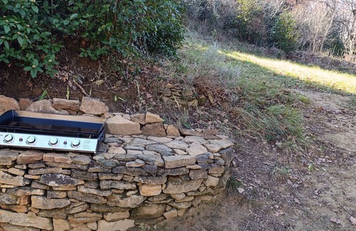 Outside, provided with a gas griddle and a charcoal barbecue + a "Weber" barbecue + an electric barbecue.