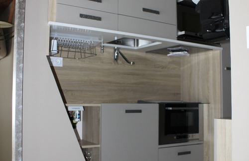 The kitchen open to the living room is fully equipped: electric hob 3 burners, hood, oven, microwave, refrigerator with freezer, dishwasher, coffee makers Nespresso & filter, kettle, toaster, cookware, vacuum cleaner.