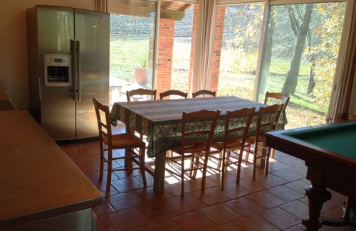 Gite on the Road of Saint Jacques, on a farm of 2 hectares with swimming pool access and clear view of the Gers countryside. The cottage has 2 bedrooms, one with a double bed, the other with 3 single beds. There is a double sofa in the living room. The apartment contains a kitchen, 2 bathrooms, pool table, TV, wifi, terrace, barbecue. Toulouse and the Toulouse-Blagnac airport is 30 minutes, shops, restaurants and public transport 3 km. At L'Isle Jourdain: open market on Saturdays, lake with water skiing, aqua-karting, tennis. Golf, horse riding nearby.