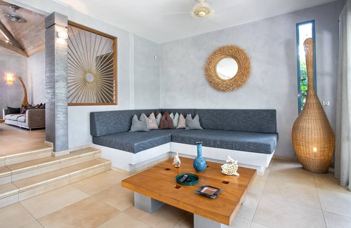 The beautifully landscaped gardens provide pleasant shaded walkways and areas for relaxation and a small side gate opens out just in front of the entrance to the beach. Les Palmiers Bleus enjoys total privacy and is located in the very quiet and secure residential area of Terres Basses on the French side of the island but within easy reach of fine dining options and nightlife.