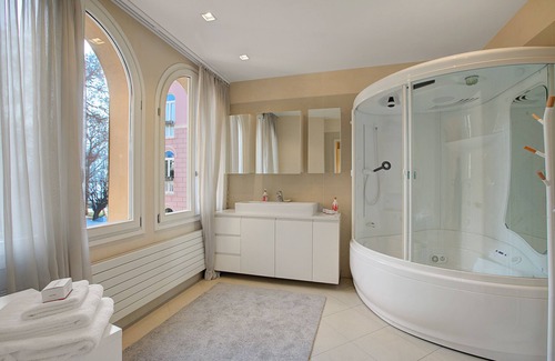 Bathroom 1: The super spacious and plush bathroom has a Jacuzzi with sauna, WC, and bidet.