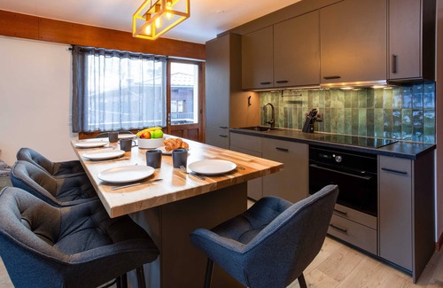 The open-plan living area also includes a fully equipped kitchen with everything you need, from a full-size oven and hob to a dishwasher, making it easy to prepare meals during your stay, the kitchen island hosts 6 comfortable stools for dining. The living room with its large L-shaped sofa and smart TV ensures plenty of options for evenings indoors after a long day exploring the mountains in the Chamonix Valley.