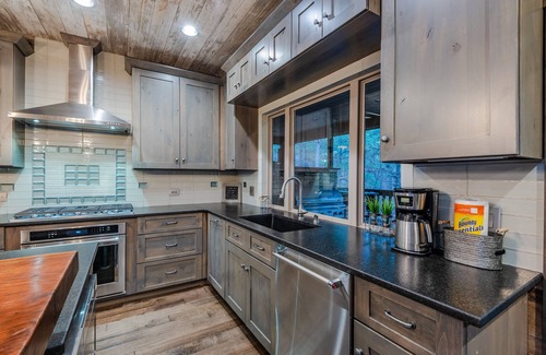 The kitchen boasts all modern finishes with upscale Shilo cabinetry and rustic brushed granite counter tops. The extra-long dining table provides seating for 8 guests and the kitchen island has a custom wood bar that allows seating for an additional 8 guests. The cozy designer breakfast nook also seats 8 more people. There is plenty of room for everyone plus extra room for guests!