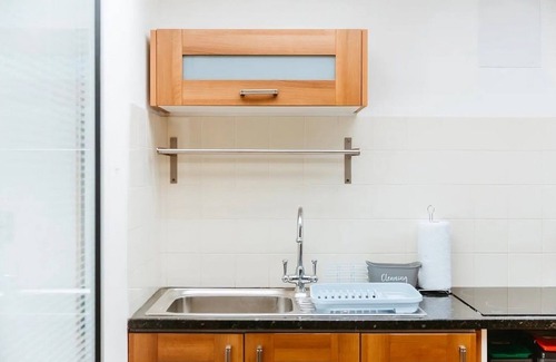The kitchen is fully equipped with essential cookware and cutleries that you'll need to cook delicious meals, such as a stove and a microwave.The apartment also has a washer and ironing equipment for your laundry needs.