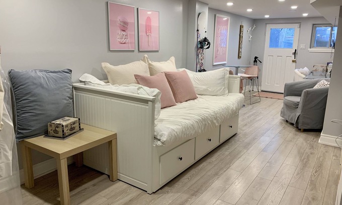This is a fabulous bright lower level apartment with separate entrance that is fully furnished has cable, internet, 65 inch TV, small counter convection oven, mini fridge, access to outdoor BBQ, closet and dressers, desk, pull out bed, brand new furniture, linens and bathroom. Access to backyard as well so if you have pets its perfect too.
