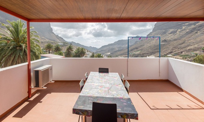 Spacious and bright property located in the town of Tasarte with capacity for 6 people, terrace and barbecue.The property has all the equipment and amenities to stay in Gran Canaria. It has two floors plus a third terrace with views of the mountains and the sea. Ground floor, fully equipped kitchen, living room with TV and toilet. The first floor has three bedrooms and a large bathroom with a shower. The 3rd floor has a terrace with garden furniture from where you can see the Tasarte valley and the sea. The house has a capacity for up to 6 people, and they will be very comfortable thanks to the generous dimensions of the property.Among the equipment, the kitchen is fully equipped with an oven, microwave, large-capacity fridge, freezer, toaster, juicer and kitchen utensils. In addition, among other elements, washing machine, ironing board, hair dryer, Wi-Fi, flat screen TV, air conditioning in the master bedroom, barbecue, terrace furniture, etc...Comfort and tranquillity with all the necessary equipment for a comfortable stay in Tasarte.The property is completely private for guest use.Tasarte is a small town between Mogán and La Aldea de San Nicolás. Of agricultural origin and fishing village in an ideal place for those who want to enjoy a quiet stay full of peace and surrounded by nature. It is an enclave chosen by nature lovers; many trails start from Tasarte from which to enjoy the heart of the Island and are appreciated by cyclists who want to train or practice their favourite sport. Tasarte has a sandy beach a few minutes' drives from the property. It is a tranquil beach with crystal clear waters, far from traditional tourist centres. You can see one of the best sunsets in the Canary Islands from the coast. A short distance away, we find the towns of Mogán and San Nicolas, where you can find all kinds of servicesTo access this property and move around the area, it is best to have your car. The area does not have public transport service