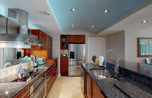 •The state-of-the-art kitchen features a breakfast bar/island with seating for 4 persons and island sink; top-of-the-line appliances from the GE Monogram series to include cook top, oven, refrigerator with ice maker, microwave – Kitchen accessories include coffee maker, toaster, blender and complete dinner service for 6