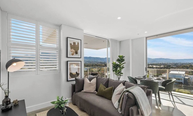 Located on the fifth floor of a secure, contemporary complex, this apartment pairs modern styling with a sweeping outlook over Wollongong, from the rugged Illawarra Escarpment and Mount Keira to shimmering glimpses of North Beach beyond the city skyline. Inside, the cosy living area offers a comfortable retreat with a soft sofa, wall-mounted TV, and a curated selection of books for leisurely moments.