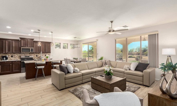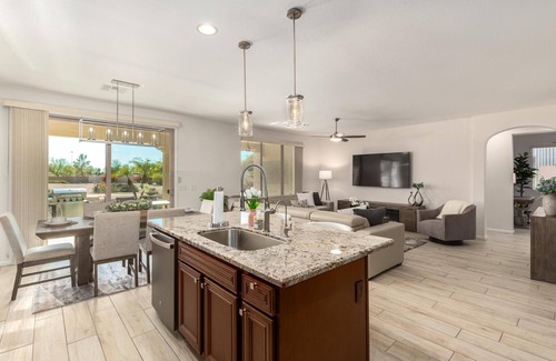 Located in the guard gated, Tuscany side of Pebblecreek, this lovely home features a covered patio area with warm winter southwest exposure, gas BBQ grill, outdoor dining table, firepit and lounge area. All new beautiful wood-like tile flooring has been installed throughout the house, the kitchen has been upgraded with new appliances, and features granite counter tops as well as an electric cook top. This home is fully stocked including, linens, cookware, glassware (including wine glasses) tableware, Keurig/drip coffee maker, blender, and enough of the staples to get you started. There is a 75" HDTV and large leather sectional sofa with built in recliners in the living room, and dining for 6 just off the kitchen.