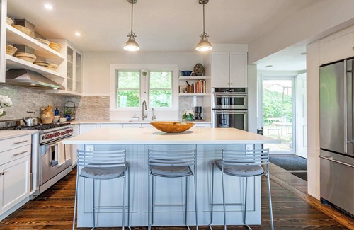 The chef’s kitchen manages to keep with the cottage theme, but with a distinctly modern edge. The 6-burner Wolf range is supplemented by a wall oven and wall microwave, and the island with barstools is always a popular spot. Once those feasts are ready, the whole gang can gather around the incredible 1700’s antique English farm table. Note the inviting bay window and window seat overlooking that fab view.