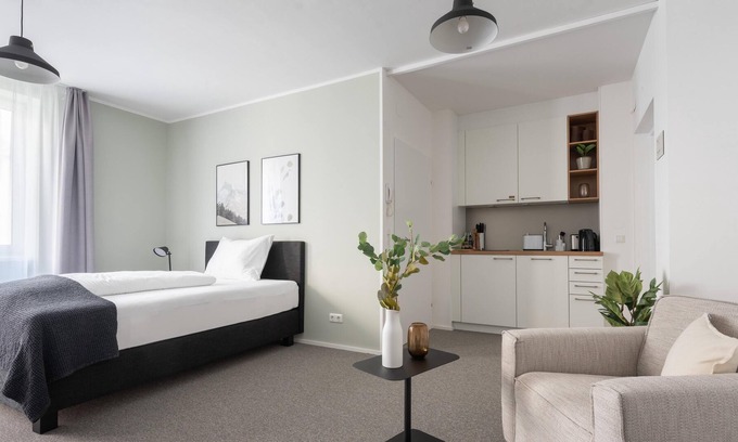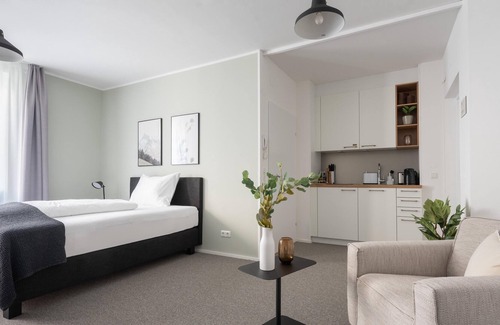 Our 29 sqm Single Suites L are the ideal choice if you are traveling alone and have been furnished to our highest modern standards. The Suites feature a fully equipped kitchen, a comfortable box-spring bed (1.40 m) including a modern smart TV and a private bathroom with shower, so you can feel at home. In case of dirty laundry, you have the possibility to wash your clothes in the shared laundry room. Therefore your apartment offers everything you need for a stay with us in just one room.