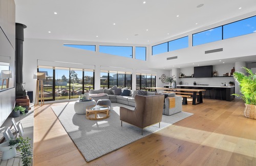Upon entering this generous new family home you will notice the natural light flooding into all aspects of the home. The open plan living area complete with wood fire place is the central hub of the home, leading to the extra large outdoor entertaining area with another fire place and out door bar area.