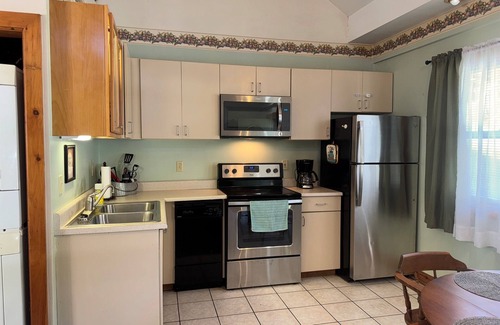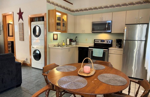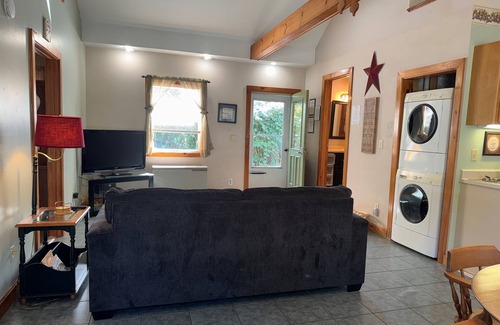 Lindsey's Cottage is all on one floor, 2 bedrooms and 1 full bathroom. Each bedroom has a queen bed and a smart TV, storage for clothing and extra blankets and pillows should you want. The main area is all open with the living room, dining area and fully equipped kitchen in one open area. There is a large smart TV in the living room for family enjoyment. The vaulted ceilings make this space feel much larger and provides lots of natural light as well. There is a washer and dryer in the living room area right next to the entrance to the full bathroom.