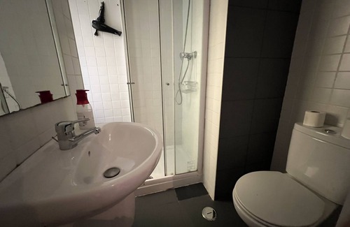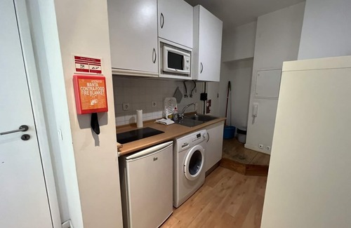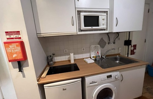 Studio in the centre of Lisbon, located in one of Alfama's alleys, with windows overlooking Beco dos Ramos. It is located on the first floor of a historic building, with traditional access via narrow stairs. It is equipped with a kitchenette and a private bathroom with a shower. The studio has a double bed, a wardrobe with hangers, a dining table and chairs and a bookcase separating the space between the bedroom area and the kitchenette. The kitchen is equipped with a fridge, washing machine/dryer, microwave and an electric hob for cookin: There is crockery (plates, glasses and cutlery) and other useful cooking utensils. The private bathroom has a shower. Bed linen and towels are included in the price.