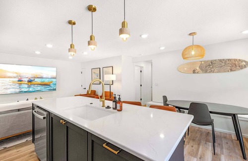 Guests will have access to communal outdoor amenities shared with the home’s sister property just next door such as the spacious, partially shaded two-tiered dock, beachfront firepit with Adirondack seating, lounge area, and barbeque grill. You can already picture yourself down by the water with a good book and refreshing beverage in hand, listening to the waves lap gently against the shore. Dine al fresco on the porch or back deck against the serene backdrop, or head indoors to surround yourself in comfort and style.