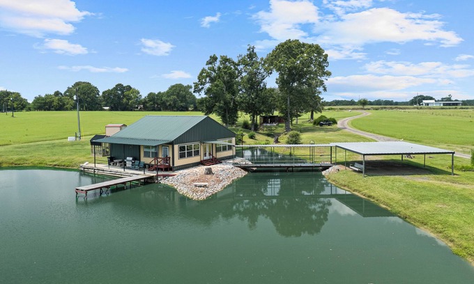Tucked away in the quiet country, this charming pond-side escape is surrounded by open pastures and wide Texas skies—with nothing but nature in sight and plenty of room to breathe. Wrapped on three sides by a fish-filled pond, it’s the perfect spot to slow down and enjoy the simple things.
